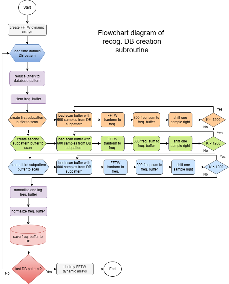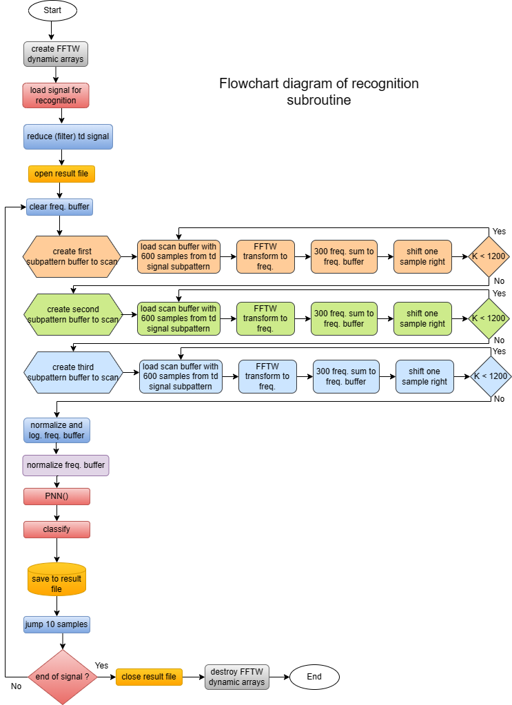 Recognition starts with signal loading. In this program, signal duration is limited to 544 mili seconds (24000 samples). Freq. patterns DB should be loaded before recognition (File --> LoadDataBase). Signal is then reduced (filtered) to half (12000 samples) with FFTW transform. After opening result file (store data for recognized patterns), program goes to recognition loop. Everything is done like in the DB creation except PNN() function in addition. PNN() (probabilistic neural network) calculates probability how much is actual pattern similar to DB patterns.