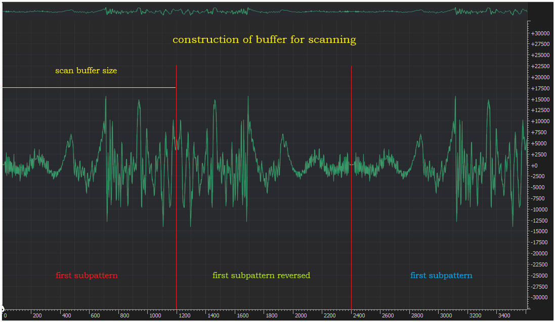 I can filter or reduce signal and patterns two times in size with FFT transform. In this case I get 1200 samples pattern size and 600 samples scan buffer size or 300 freq. With three subpatterns, I get 900 freq. for database freq. pattern size. This can significantly speed up the process of recognition.